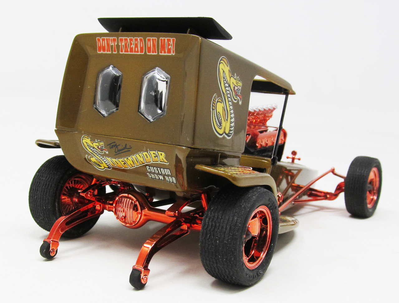 Skala 1/24. Nowe spojrzenie na klasykę TD. Ten zestaw jest wykonany w kolorze brązowym z chromowanym drzewkiem w kolorze wypalonej miedzi. Zawiera gumowe opony i przezroczyste szkło. Nowe grafiki i kalkomanie autorstwa Kelly Daniel.